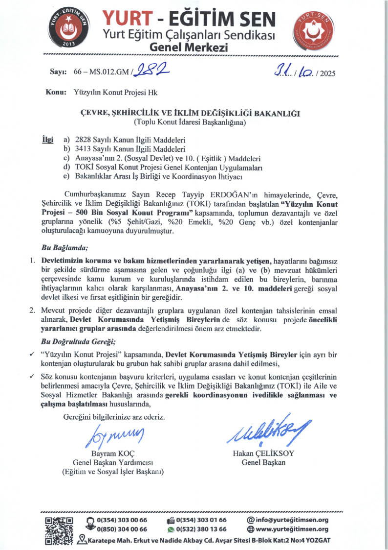 YURT – Eğitim Sen olarak, Cumhurbaşkanlığı’na, Aile ve Sosyal Hizmetler Bakanlığı’na ve Çevre Şehircilik ve İklim Değişikliği Bakanlığı’na (TOKİ) gönderdiğimiz yazıyla “Yüzyılın Konut Projesi – 500 Bin Sosyal Konut Programı” kapsamında devlet korumasında yetişmiş bireyler için özel kontenjan ayrılmasını talep ettik.